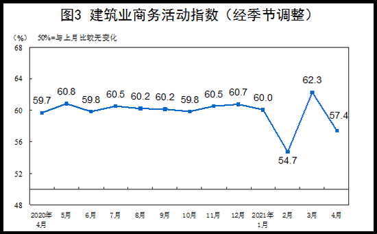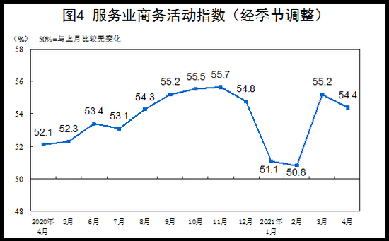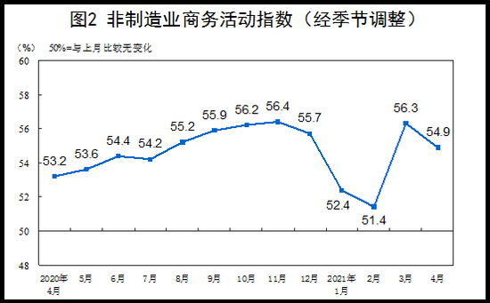 4月份,非制造業商務活動指數為54.9%,較上月回落1.4個百分點,非制造業擴張步伐有所放緩。