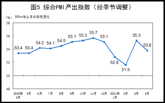 4月份,綜合PMI產出指數為53.8%,比上月回落1.5個百分點,表明我國企業生產經營活動總體擴張力度減弱。