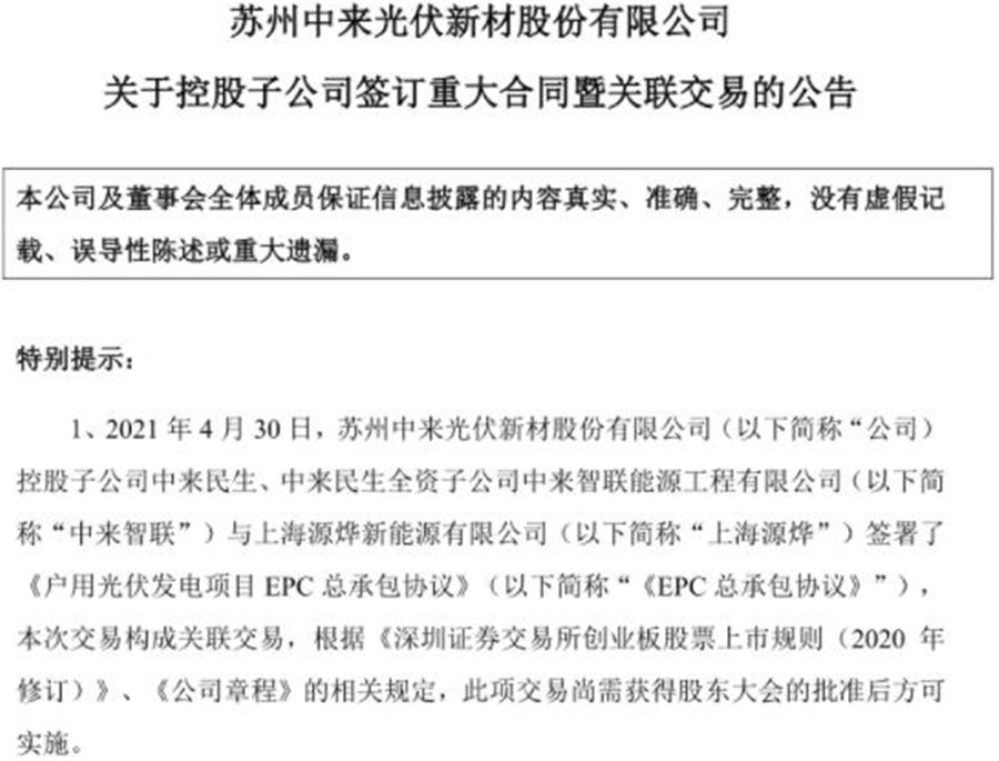 公告顯示,中來股份控股子公司中來民生、中來民生全資子公司中來智聯(lián)能源工程有限公司(以下簡稱“中來智聯(lián)”)與上海源燁新能源有限公司(以下簡稱“上海源燁”)簽署了《戶用光伏發(fā)電項目EPC總承包協(xié)議》。