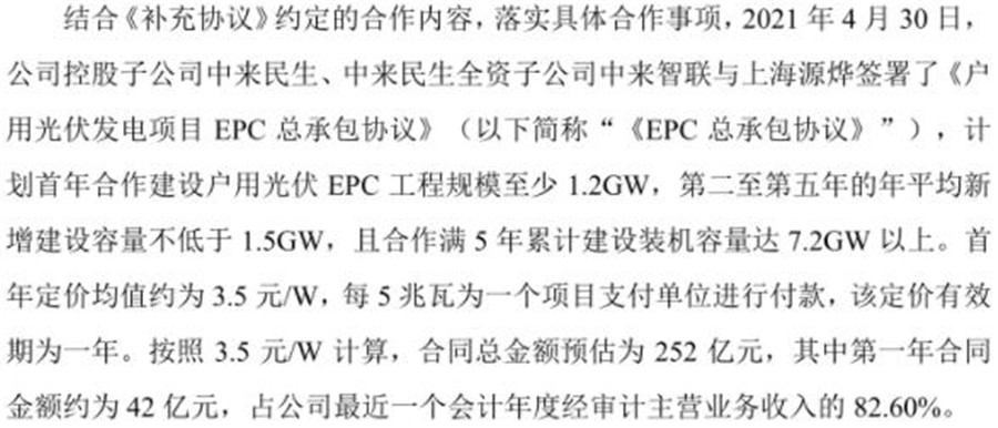 首年定價均值約為3.5元/W,每5兆瓦為一個項目支付單位進(jìn)行付款,該定價有效期為一年。按照3.5 元/W計算,合同總金額預(yù)估為252億元,其中第一年合同金額約為42億元,占公司最近一個會計年度經(jīng)審計主營業(yè)務(wù)收入的82.60%。