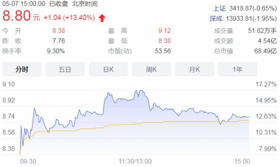 受此利好影響,5月7日中來股份股價大漲,一度逼近漲停,截至收盤股價收于8.80元,漲幅為13.40%,總市值為68.49億元。