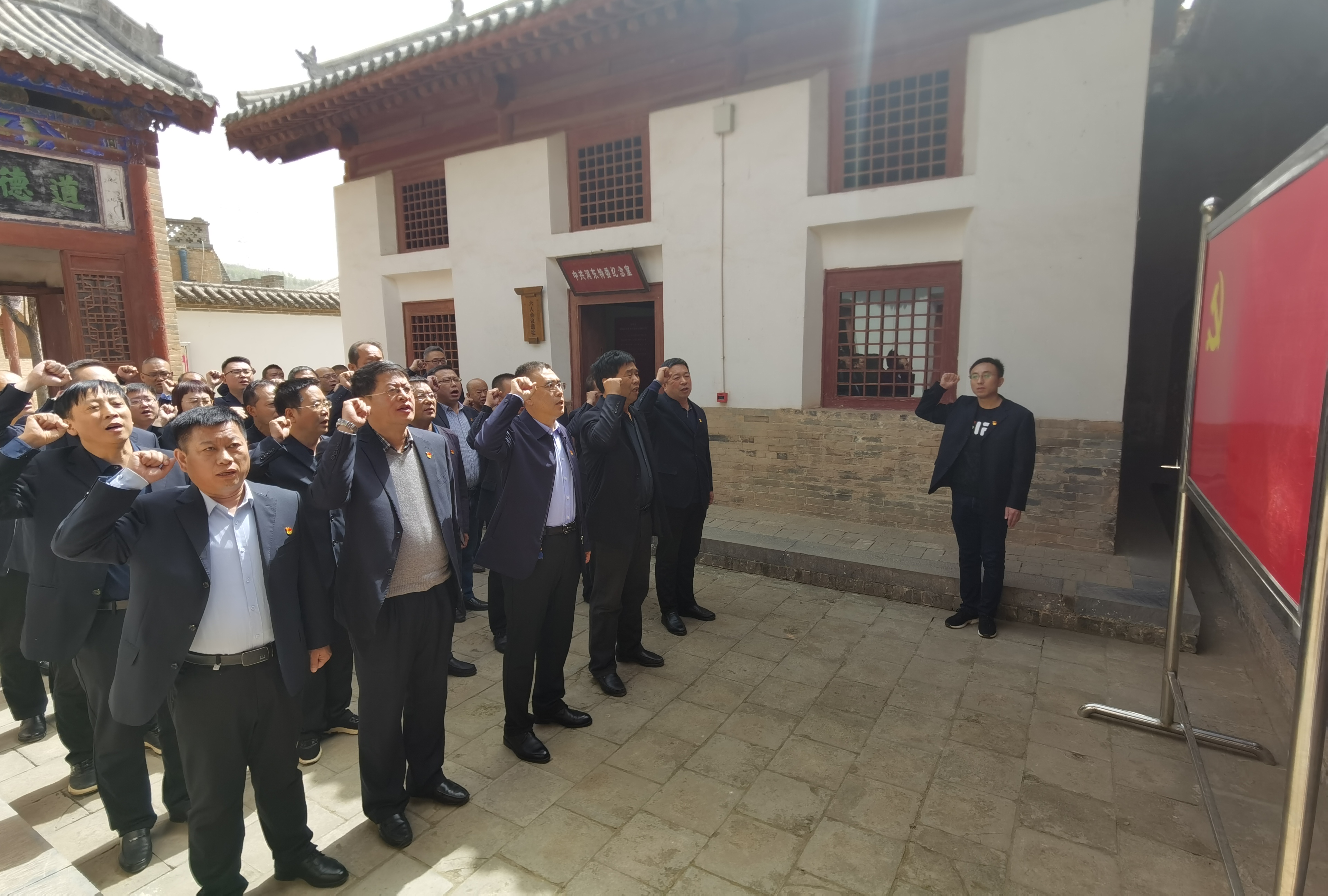 堆云洞自1965年以“河東特委活動舊址”公布為山西省重點文物保護單位。它位居稷王山前麓的丘嶺地帶。1928年6月,省委派汪銘來河東恢復黨組織期間,在嘉康杰引薦下,于堆云洞召開“河東地區黨組織會議”,成立了河東特委。1929年7月又在堆云洞召開“河東特委會議”,改特委為特支。1937年11月,在聞、夏一帶為八路軍擴兵500,同年12月,中共北方局在臨汾劉村召開山西黨的活動分子會議上,劉少奇稱贊嘉康杰是河東“群眾領袖”。這里沿狹窄石階,拾級而上,大家參觀了嘉康杰等革命先烈當時秘密印發文件和傳單的三拐窯、召開秘密會議的暗室以及與敵人周旋脫身的水井等遺址。在“河東黎明前的曙光”展、嘉康杰同志主題展前,認真閱覽革命事跡圖文展覽。大家在堆云洞景區,在河東特委革命舊址前,全體黨員干部面對鮮艷的黨旗,高舉右手,再次莊嚴宣誓:我志愿加入中國共產黨……隨時準備為黨和人民犧牲一切,永不叛黨!鏗鏘恢弘的誓詞,一字一句,神圣而豪邁,再次洗禮大家的心靈。