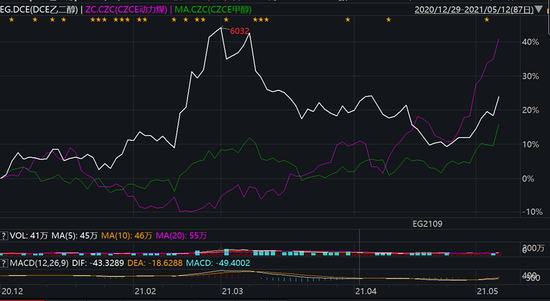 乙二醇此輪反彈從4月底開(kāi)始,僅半月時(shí)間漲幅達(dá)到14%,盤(pán)面強(qiáng)勢(shì)主要受原料煤價(jià)格大幅上漲影響。