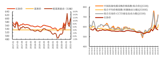 根據(jù)國(guó)內(nèi)主流煤炭企業(yè)公告,2021年長(zhǎng)協(xié)煤價(jià)基準(zhǔn)價(jià)為535元/噸為基準(zhǔn)價(jià),浮動(dòng)價(jià)參考環(huán)渤海BSPI、秦皇島CCTD、沿海電煤采購(gòu)價(jià)格CECI三大煤炭指數(shù)(各家煤炭企業(yè)選取的參照指數(shù)略有不同)。