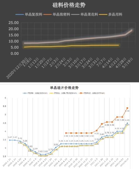 多晶硅料的“漲”勢仍在持續(xù),根據(jù)硅業(yè)分會5月19日價格跟蹤,本周國內(nèi)單晶復(fù)投料價格區(qū)間在17.4-20.0萬元/噸,成交均價為19.44萬元/噸;單晶致密料價格區(qū)間在17.2-19.8萬元/噸,成交均價為19.00萬元/噸。