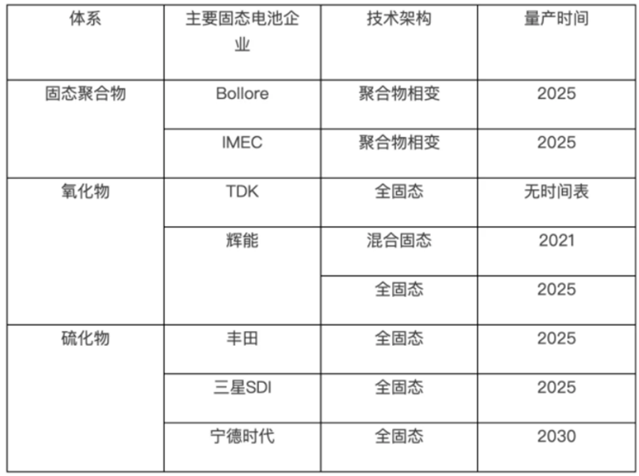 固態(tài)電池根據(jù)不同的電解質(zhì)又分為聚合物、氧化物、硫化物三種體系電解質(zhì)。電解質(zhì)技術(shù)也是固態(tài)電池商業(yè)化生產(chǎn)技術(shù)最難突破的一點。目前,全固態(tài)電解質(zhì)鋰動力電池存在的技術(shù)難點問題包括固態(tài)電解質(zhì)材料的鋰離子電導率偏低問題、固/固界面接觸性和穩(wěn)定性差問題、金屬鋰的可充性問題等。目前對比固態(tài)電池技術(shù)比較先進的企業(yè)量產(chǎn)時間表中,我們發(fā)現(xiàn)大部分量產(chǎn)提到的一個時間點是2025年。也就是說2025年之前全固態(tài)商用的可能性極低,符合業(yè)內(nèi)專業(yè)人士預測。其中值得關(guān)注的是輝能科技,輝能科技給出了混合固態(tài)電池量產(chǎn)時間是在2021年,結(jié)合輝能科技與蔚來的密切合作關(guān)系,蔚來發(fā)布會宣傳的1000km固態(tài)電池很有可能是輝能的混合固態(tài)電池產(chǎn)品。但是未來輝能混合固態(tài)電池量產(chǎn)能否產(chǎn)生合理的市場經(jīng)濟性還需要等量產(chǎn)后繼續(xù)論證。