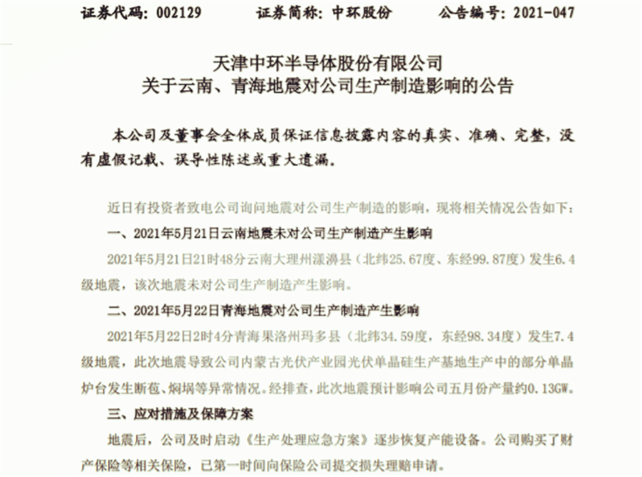 5月22日2時(shí)4分青海果洛州瑪多縣(北緯34.59度,東經(jīng)98.34度)發(fā)生7.4級(jí)地震,此次地震導(dǎo)致中環(huán)股份內(nèi)蒙古光伏產(chǎn)業(yè)園光伏單晶硅生產(chǎn)基地生產(chǎn)中的部分單晶爐臺(tái)發(fā)生斷苞、燜堝等異常情況。經(jīng)排查,此次地震預(yù)計(jì)影響公司五月份產(chǎn)量約0.13GW。