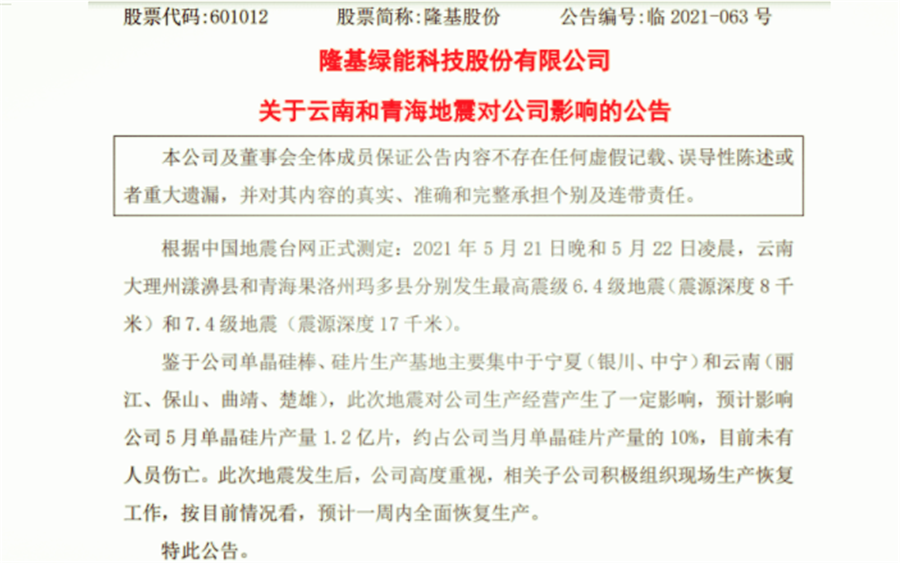 響5月24日晚間,隆基股份發(fā)布關(guān)于云南和青海地震對(duì)公司影響的公告。公告表示,根據(jù)中國(guó)地震臺(tái)網(wǎng)正式測(cè)定,2021年5月21日晚和5月22日凌晨,云南大理州漾濞縣和青海果洛州瑪多縣分別發(fā)生最高震級(jí)6.4級(jí)地震(震源深度8千米)和7.4級(jí)地震(震源深度17千米)。