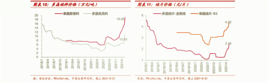 則表示,當(dāng)前硅料價(jià)格持續(xù)上漲,單晶方面,五一后成交價(jià)在缺料的影響下進(jìn)一步上揚(yáng),目前一線企業(yè)已經(jīng)有價(jià)無(wú)貨;多晶方面,價(jià)格跟隨單晶料漲價(jià)。同時(shí),硅片價(jià)格上漲,單晶方面,硅料短缺影響開(kāi)工率,電池廠反應(yīng)硅片長(zhǎng)單交付量不足,價(jià)格堅(jiān)挺;多晶方面,印度需求受疫情影響稍有放緩,但硅料上漲繼續(xù)推高價(jià)格。