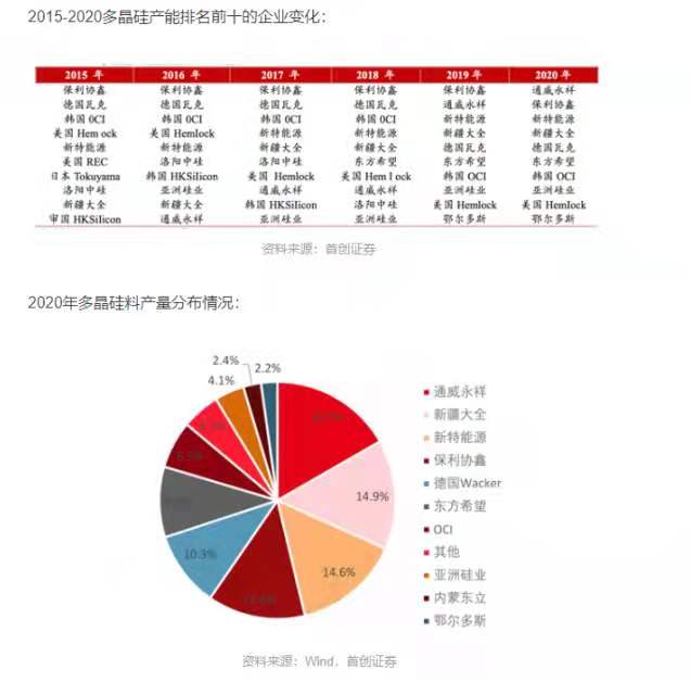 硅業(yè)分會(huì)的相關(guān)數(shù)據(jù)顯示,東方希望在2020年的產(chǎn)能在4萬(wàn)噸,在2021年產(chǎn)能可達(dá)到7萬(wàn)噸。其官網(wǎng)顯示,截止到2020年,多晶硅一期產(chǎn)能6萬(wàn)噸/年,規(guī)劃產(chǎn)能30萬(wàn)噸/年。