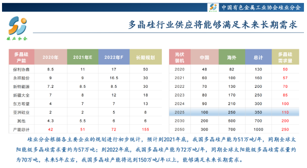 2021年,乃至2022年,多晶硅的供給將呈現(xiàn)緊平衡狀態(tài)。日前,通威股份董事長(zhǎng)謝毅在5月7日股東大會(huì)上表示,由于前幾年硅料項(xiàng)目投資回報(bào)不大、行業(yè)擴(kuò)產(chǎn)少,導(dǎo)致目前硅料供給不足;在未來(lái)18個(gè)月或更長(zhǎng)時(shí)間里,硅料供給或?qū)⒊掷m(xù)緊張,價(jià)格可能會(huì)持續(xù)向好。通威作為多晶硅行業(yè)的龍頭企業(yè),對(duì)市場(chǎng)的認(rèn)知和預(yù)判無(wú)疑更具有一定的說(shuō)服力。