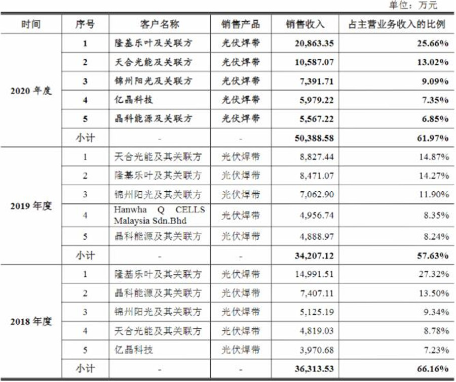 據宇邦新材招股說明書顯示,其已獲得龍頭企業認可,近三年公司最大客戶分別為隆基股份跟天合光能,兩者都是我國排名前五的組件龍頭。其它客戶例如錦州陽光、億晶科技和晶科能源,也是龍頭企業,前五大客戶占主營業務收入比例連續三年都在60%左右,合作比較穩定。