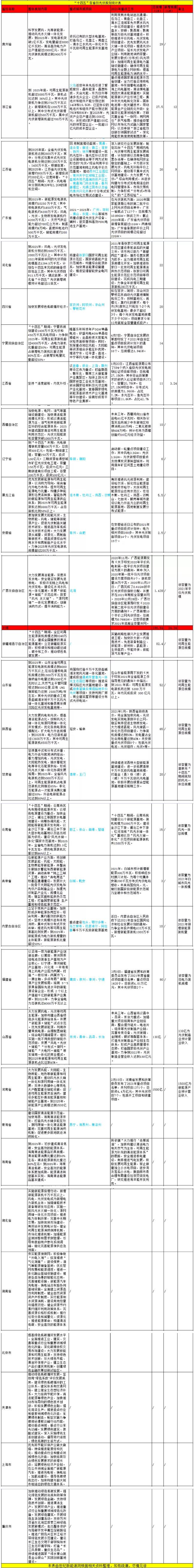 據(jù)世紀(jì)新能源網(wǎng)不完全統(tǒng)計(jì),截止已公開(kāi)數(shù)據(jù),有13個(gè)省明確規(guī)劃了光伏建設(shè)體量,總?cè)萘?96.94GW;有4個(gè)省明確規(guī)定了風(fēng)光建設(shè)體量,總?cè)萘?8GW;有2個(gè)省明確了“十四五”末期的光伏制造業(yè)收入;青海省雖然沒(méi)有規(guī)定具體建設(shè)體量,但光伏一直是其重點(diǎn)發(fā)展項(xiàng)目;北京、天津、上海、重慶四個(gè)直轄市,則把更多把注意力放在消納方面。