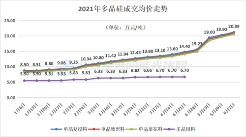 自2021年以來,多晶硅價價格便開啟了直線上漲模式。據統計,自年初以來單晶復投料漲幅達到了141.89%,單晶致密料漲幅達到了145.769%,單晶菜花料漲幅達到了150.24%。并且,硅料價格長單、散單價格還在延續上漲勢頭。據悉,6月份有三家萬噸級硅料企業被迫計劃檢修,預計6月份國內多晶硅產量將進一步減少,降幅在3%左右。