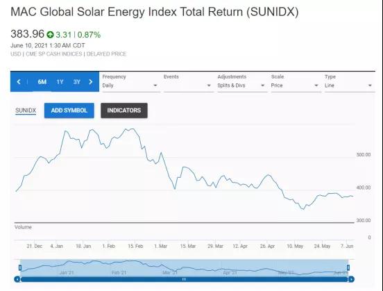 供應(yīng)鏈的浮動(dòng)和各種成本上漲已經(jīng)波及到了資本市場,五月上旬,(詳情點(diǎn)擊:原材料漲價(jià)致美國光伏股暴跌,Sunworks、Array Technologies跌幅超40%),最近幾周,MAC全球太陽能指數(shù)自年初至今跌幅超24%。