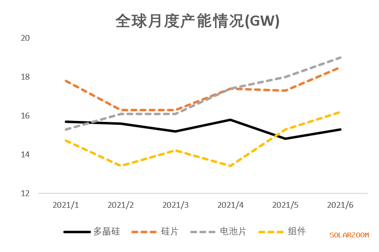 2021年4月,受產(chǎn)業(yè)鏈價格影響,導(dǎo)致整體市場需求略有下降,中國大陸市場的太陽能電池片產(chǎn)量較上月略有下降