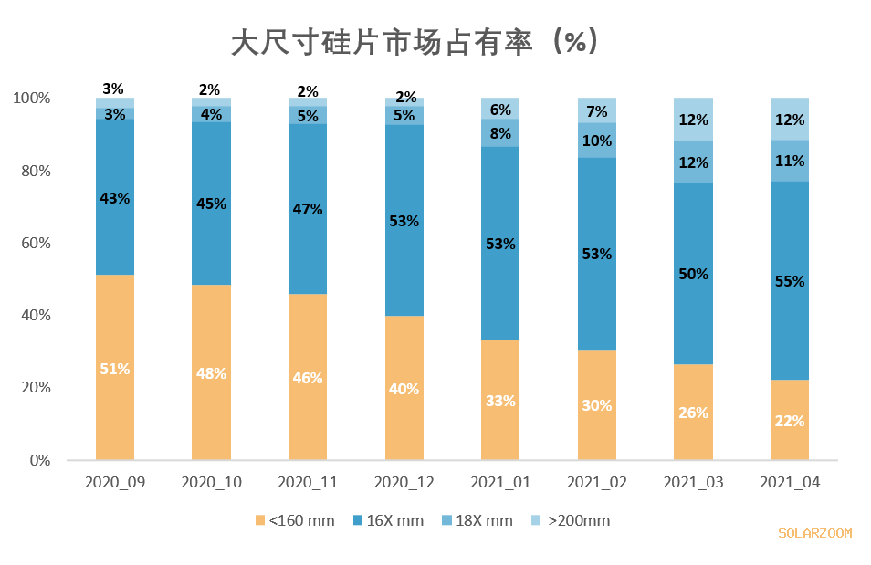 從2020年9月起,大尺寸硅片(>160mm)的市場從49%增加到78%