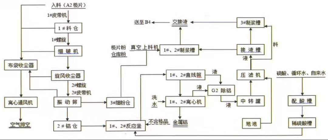 鋁渣為A3車間提取三元廢舊電池極片上的鎳、鈷、錳過程中所產生的附屬產品。邦普科技公司2018年8月15日開始執行的鋁渣生產工藝流程為:廢舊電池極片從A2車間輸送至A3車間進入1#料倉,經過細破機,廢舊極片被打成小碎片(2012年12月22日開始執行的工藝前期流程為:廢舊電池極片經過粗破機破碎后,先后經過電加熱鋼帶爐和錘片式破碎機,被打成小碎片。后續工藝流程不變),在碾壓撕扯中,部分鋁箔和表面粉料被機械分離,物料經過振動篩,篩上物為鋁渣,鋁渣表面附著大量的正極材料,篩下的極片粉料直接送往B4車間制漿,用于后續工藝。鋁渣輸送到反應釜中與稀硫酸(0.5mol/L)混合,經過20分鐘的高速攪拌,使鋁渣和粉料分離。固液混合物經過直線篩后,鋁渣送至離心機洗水、甩干,鋁渣裝袋后送至危險廢物暫存庫待檢區,剛出來未冷卻的鋁渣不允許堆垛,檢測合格后才允許在危險廢物暫存庫存放區堆碼(在待檢區主要檢測鈷鎳殘指標,最終鋁渣的鈷鎳殘留總含量控制標準在4%以下為合格,檢測結果一般需要一天)。鋁渣儲存數量達到裝車要求后,直接向外銷售。