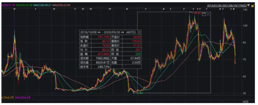 作為鋰電材料的龍頭,贛鋒鋰業(yè)(002460.SZ)的市值從2010年8月10日上市以來的59億元抬升至如今的1400億元,期間經(jīng)歷了幾波上漲。到了2021年1月25日,股價更是達到歷史最高點149.3元/股。但隨后,贛鋒鋰業(yè)經(jīng)歷了長達兩個月左右的回調(diào),直到6月才反彈至前期高點附近。