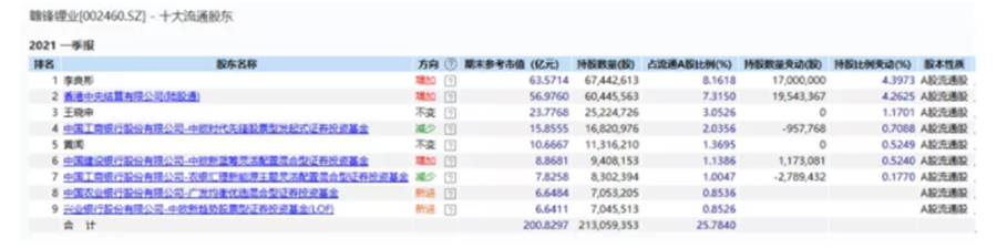 在贛鋒鋰業(yè)上漲期間,機構(gòu)投資者獲利豐厚。從2021年一季報公司披露的前十大流通股中可以看到,多位明星基金經(jīng)理赫然在列,包括中歐基金的代表人物周蔚文、周應(yīng)波,農(nóng)銀匯理的2020年度業(yè)績冠軍趙詣,可謂眾星云集。