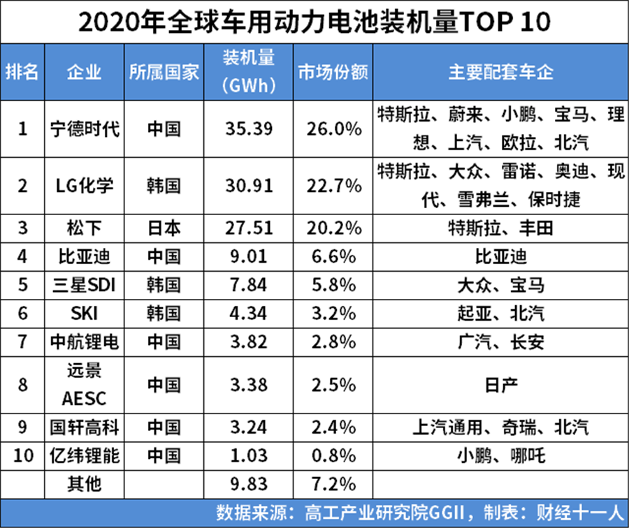 電池企業更是如此,2020年全球動力電池企業裝機量TOP10(見表1)當中,一家美國企業都沒有,中國6家,韓國3家,日本1家,東亞三強瓜分了動力電池92%以上的市場份額。如果說美國在這方面還能有所指望的話,特斯拉仍是唯一的希望。在2020年財報當中,特斯拉透露,2022年特斯拉的動力電池產能將達到200GWh,產量100GWh,成為全球最大的動力電池制造商。但還是同樣的問題,指望特斯拉一家企業對抗其他競爭者的集團優勢,難言希望巨大。而且特斯拉的未來產能中的一大部分還會布局在中歐。