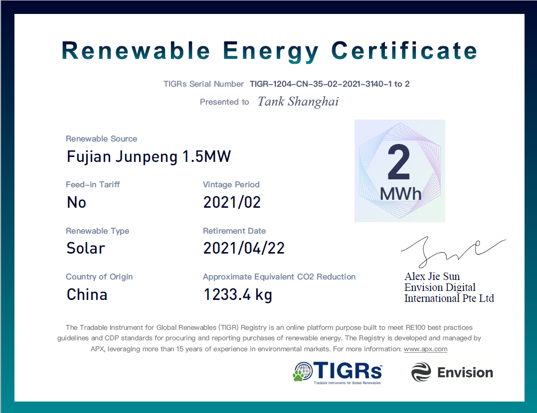 第二種主流的國際綠證是APX簽發的TIGRs。國際綠證簽發機構APX創建了可再生能源證書注冊、追蹤、轉移的在線平臺,其追蹤北美以外地區企業可再生能源采購情況,APX簽發的綠證叫做TIGRs。