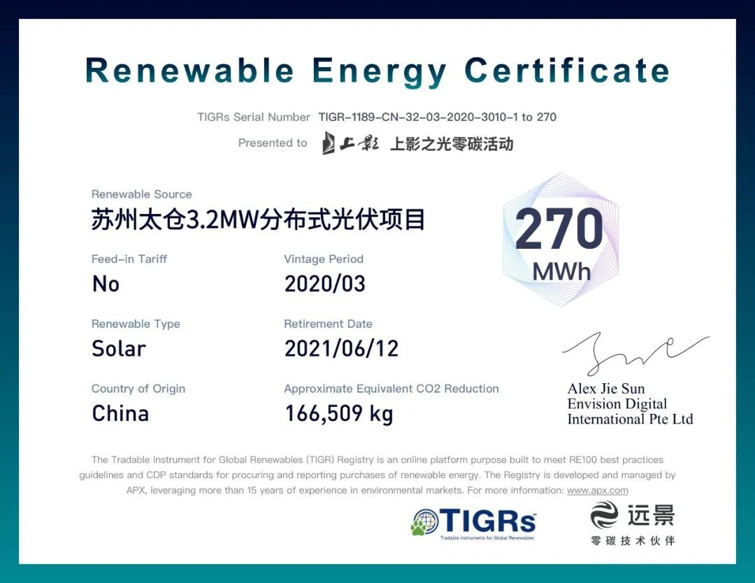 該綠證由景旦新能源投資的分布式光伏平價項目產生,基于遠景智能物聯平臺EnOS進行線上核查并由APX進行簽發,遠景EnOS平臺提供的物聯網和區塊鏈技術確保了此次購買平價綠證的唯一性和可追溯,確保了整體綠證交易的安全和可靠性。