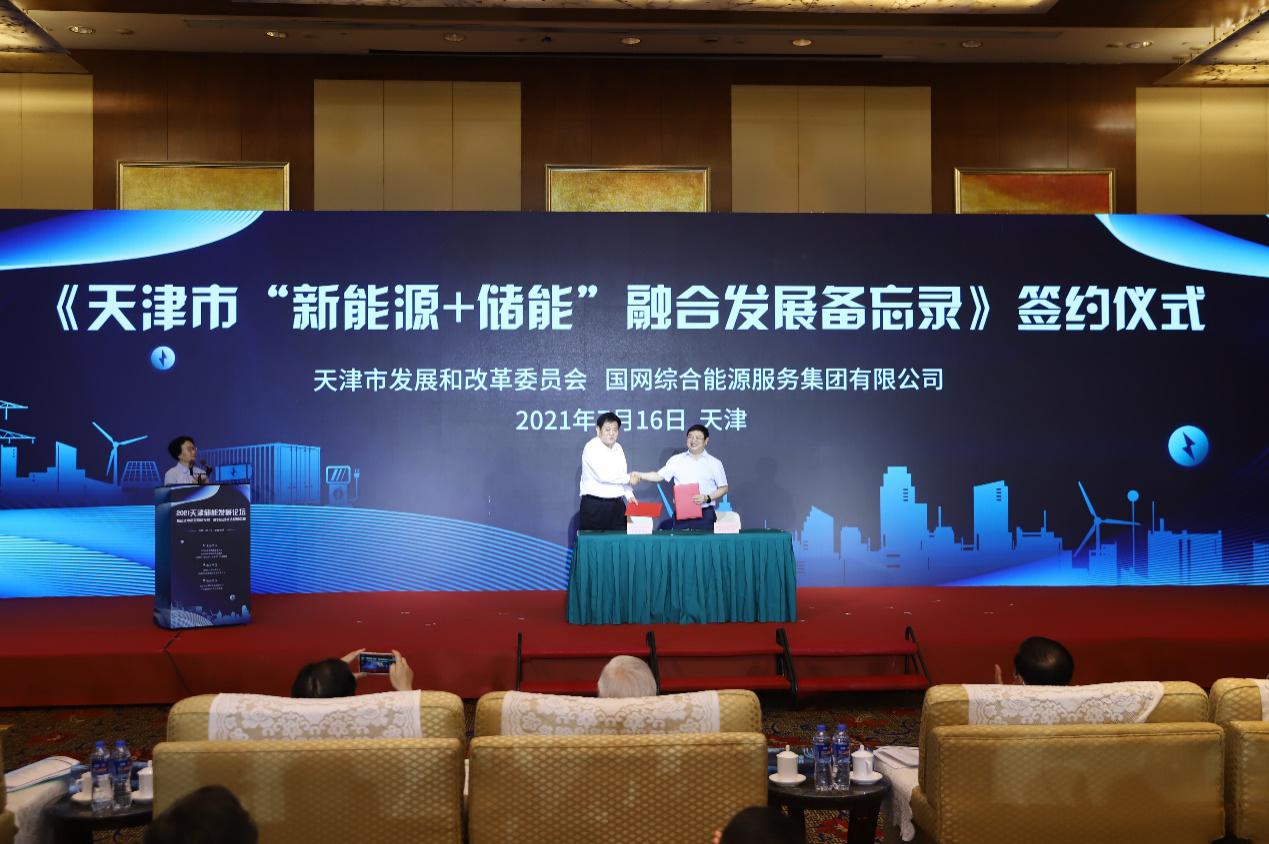 在簽約儀式環節,天津市發展和改革委員會副主任楊志耘與國網綜合能源服務集團有限公司黨委委員、副總經理樊功成上臺簽署《天津市“新能源+儲能”融合發展備忘錄》。