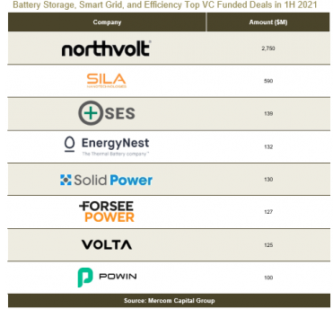 電池廠商和儲能廠商主導著企業融資的格局。下圖是2021年上半年的主要交易,包括電池儲能系統、智能電網和能源效率的廠商,但名列前茅的交易都是電池廠商和儲能廠商。