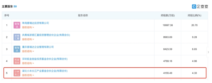 企查查數據顯示,2018年12月,小米產投就曾對珠海冠宇進行了投資,持有珠海冠宇4.3%的股份,是其第五大股東。