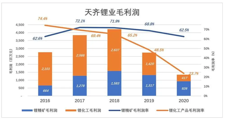 2019年、2020年受新能源車補貼退坡及疫情等因素影響,兩項業(yè)務(wù)毛利潤都大幅下跌,但“賣礦石”業(yè)務(wù)明顯抗跌。到2020年,鋰精礦業(yè)務(wù)毛利潤9.3億,是鋰化工業(yè)務(wù)的222%,毛利潤率仍高達(dá)62.5%。