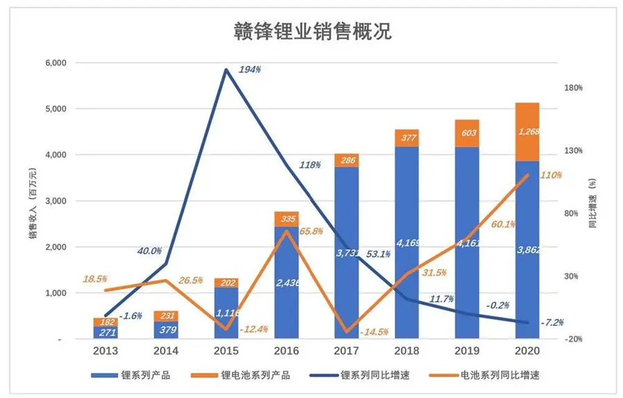 天齊的第二塊收入“鋰精礦”,相當(dāng)于賣資源;贛鋒的第二塊收入是“賣電池”,比鋰化工原料還要更進(jìn)一步。2020年,贛鋒鋰電池收入超過12億,同比增長110%。
