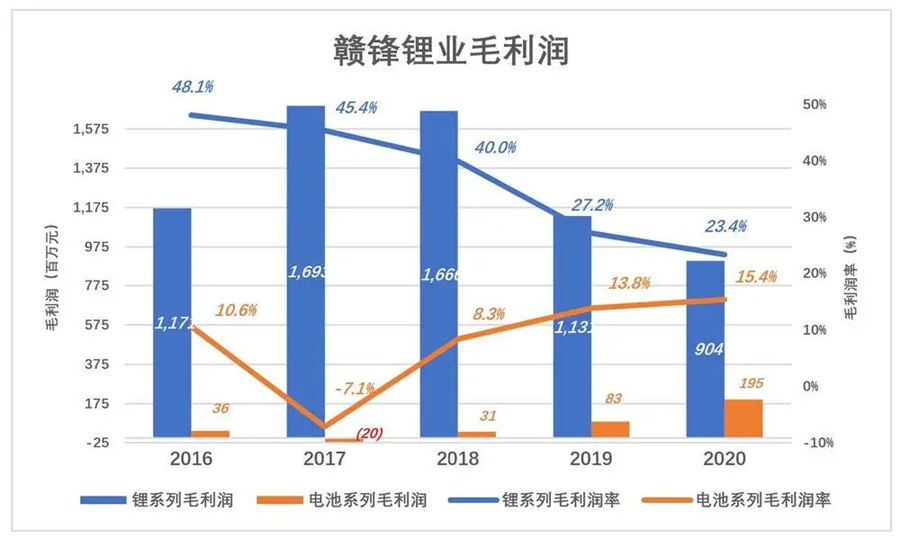 贛鋒鋰電池業(yè)務(wù)初見成效,2017年毛利潤率負(fù)7.1%,2020年爬升至15.4%(寧德時代動力電池毛利潤率為26.6%),金額不足2億。研發(fā)、管理、市場費用一扣,電池業(yè)務(wù)肯定虧損。而天齊賣賣鋰礦石,2020年毛利潤達(dá)到9.3億。整體算下來,2020年贛鋒毛利潤僅為天齊的88%(2019年為46%)。