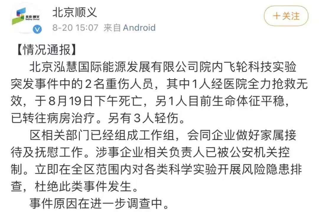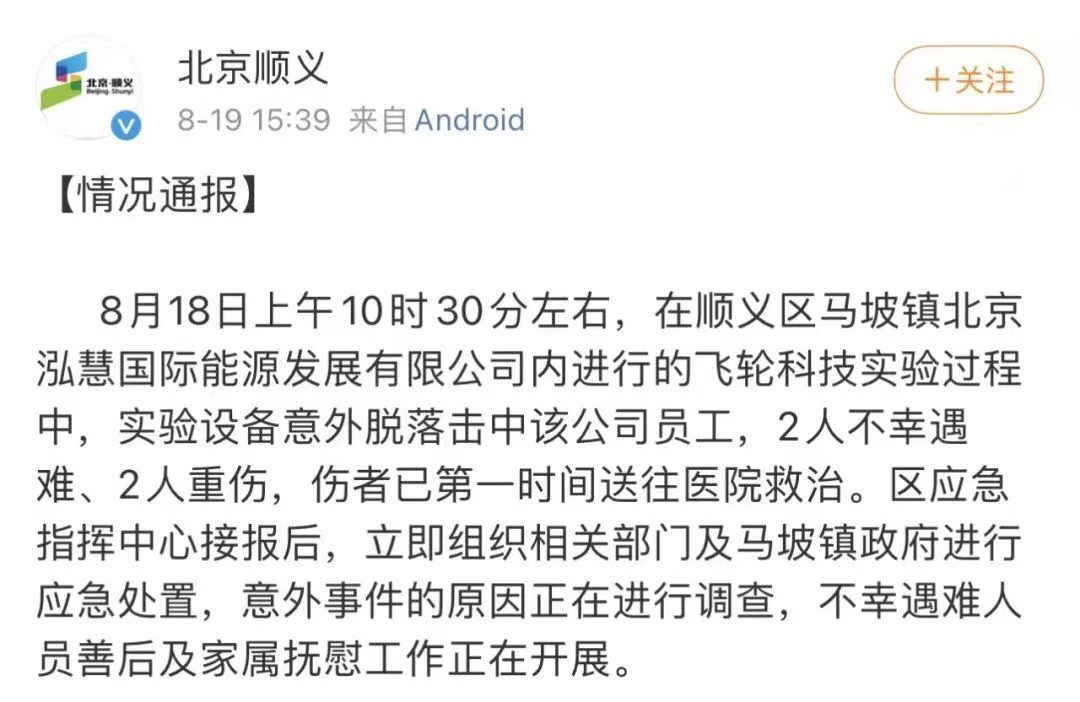 8月18日上午10時30分左右,在北京市順義區馬坡鎮北京泓慧國際能源發展有限公司內進行的飛輪科技實驗過程中,實驗設備意外脫落擊中該公司員工,2人不幸遇難、2人重傷,傷者已第一時間送往醫院救治。區應急指揮中心接報后,立即組織相關部門及馬坡鎮政府進行應急處置,意外事件的原因正在進行調查,不幸遇難人員善后及家屬撫慰工作正在開展。