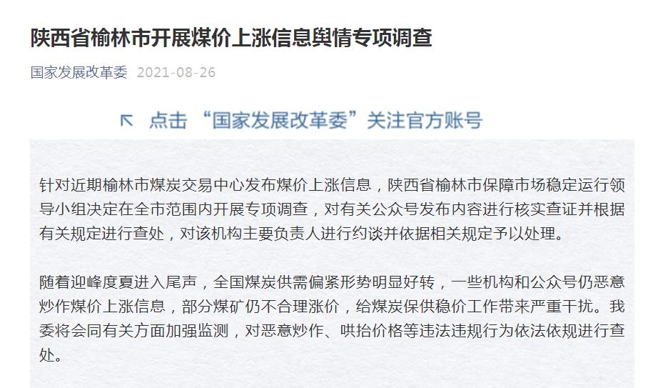 據國家發改委官方微信26日消息,針對近期榆林市煤炭交易中心發布煤價上漲信息,陜西省榆林市保障市場穩定運行領導小組決定在全市范圍內開展專項調查,對有關公眾號發布內容進行核實查證并根據有關規定進行查處,對該機構主要負責人進行約談并依據相關規定予以處理。