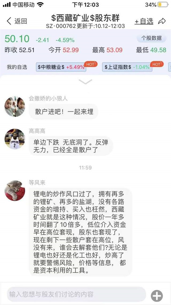 在尺度的西藏礦業(yè)股東群,有投資者稱(chēng),鋰電的炒作風(fēng)口過(guò)了,擁有再多的鋰礦、再多的鹽湖,沒(méi)有各路資金的增持、買(mǎi)入也枉然,西藏礦業(yè)就是這種情況,股價(jià)一年多時(shí)間翻了10倍多,低位介入資金早在高位套現(xiàn),股東也套現(xiàn)了,現(xiàn)在剩下一些散戶(hù)套在高位,風(fēng)沒(méi)有來(lái),誰(shuí)會(huì)去解套他們?無(wú)論是鋰電也好還是化工也好,炒高了就要警惕風(fēng)險(xiǎn),賽道、價(jià)格等信息,容易成為資本利用的工具。