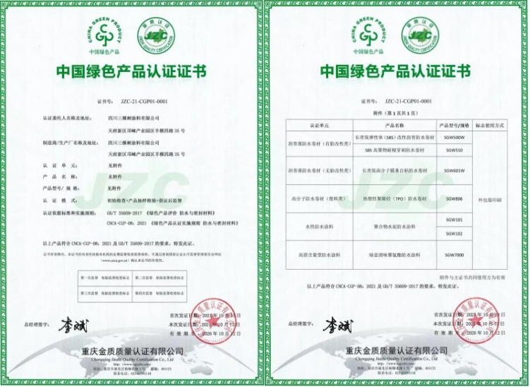 (▲三棵樹防水 中國綠色產(chǎn)品認(rèn)證證書)