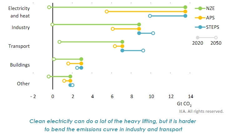 IEA的報告要表述的意向非常清晰:實現“2050年凈零排放方案”有很大的困難,但綜合、整體利益巨大;在技術方面,即使眼前有最具競爭力的發電技術,也要堅決限制落后產能的高耗能項目。