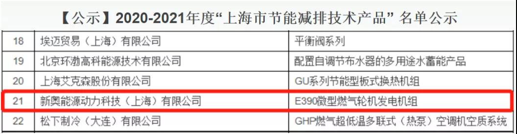 為加快節(jié)能減排技術(shù)產(chǎn)品推廣應(yīng)用,助力“雙碳”工作,受上海市經(jīng)濟和信息化委員會委托,上海市能效中心(上海市產(chǎn)業(yè)綠色發(fā)展促進中心)組織開展2020-2021年度“上海市節(jié)能減排技術(shù)產(chǎn)品”申報和評審工作。官方已于9月份發(fā)布公示名單,新奧動力E390微型燃?xì)廨啓C發(fā)電機組榮耀上榜!