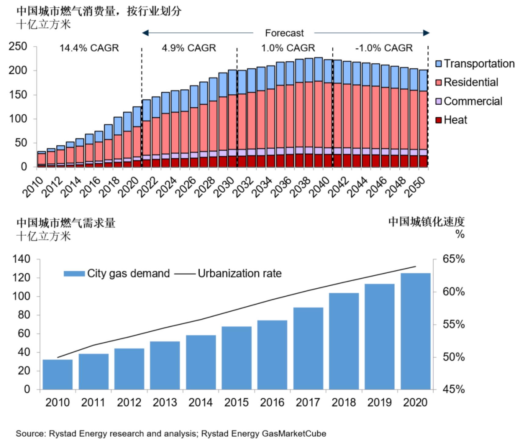 在過去十年里,中國的城市燃氣需求幾乎增長了三倍,在2020年達到1250億立方米,這得益于中國城鎮(zhèn)化速度加快,城鎮(zhèn)人口比重從20年前的不到40%提升至目前的64%。