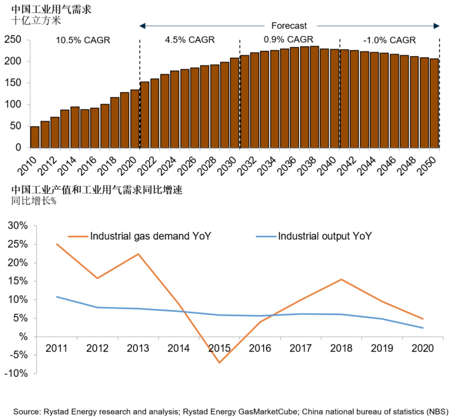 由于政府持續(xù)推進供給側(cè)結(jié)構(gòu)性改革,淘汰過剩產(chǎn)能以及控制工業(yè)生產(chǎn)中的能源消耗,近幾年中國工業(yè)產(chǎn)值增速已經(jīng)放緩。這使工業(yè)用氣同比增速從2010年代初的兩位數(shù)降至2020年的4.8%,2020年工業(yè)用氣也因疫情受到抑制。