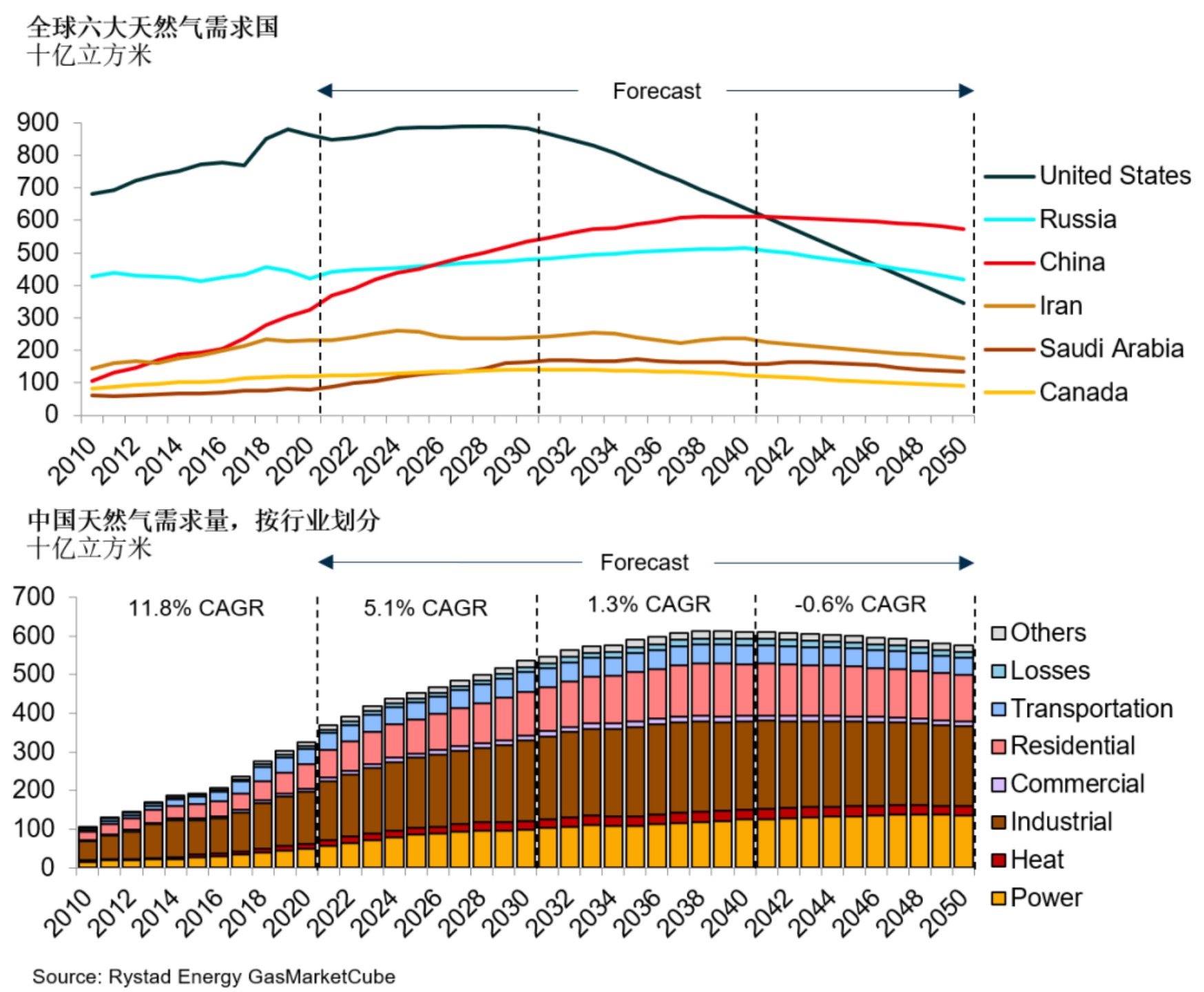 為了實現(xiàn)2060年碳中和目標,隨著可再生能源在中國能源結(jié)構(gòu)中的占比越來越大,睿咨得能源(Rystad Energy)預計,2030-2040年中國天然氣需求年均復合增長率將放緩至1.3%。隨著從2030年起美國的化石燃料需求將以更快的速度下降,預計中國將在2040年代初超過美國,成為全球最大的天然氣消費國。