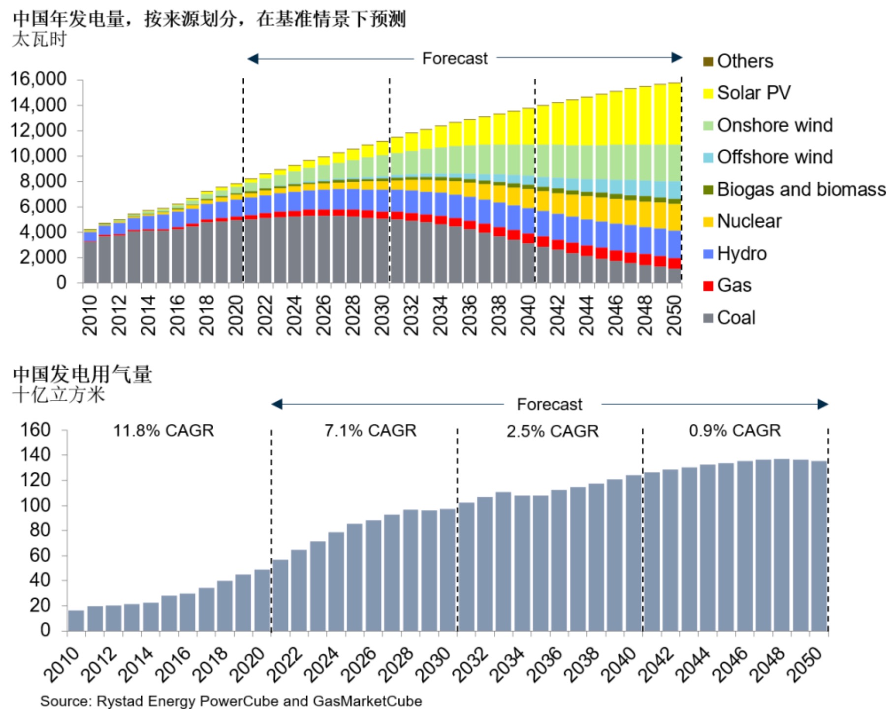 睿咨得能源(Rystad Energy)預計,在2020-2030年期間,中國發(fā)電用氣需求將以7.1%的年均復合增長率增長,期間將有更多的燃氣電廠投產(chǎn)用于調(diào)峰。2030-2040年發(fā)電用氣需求年均復合增長率將放緩至2.5%,但屆時將是中國天然氣需求增長的主要驅(qū)動力,為了實現(xiàn)2060年碳中和目標,中國正在穩(wěn)步降低煤炭發(fā)電的比重,而天然氣將對確保電力穩(wěn)定供應(yīng)至關(guān)重要。