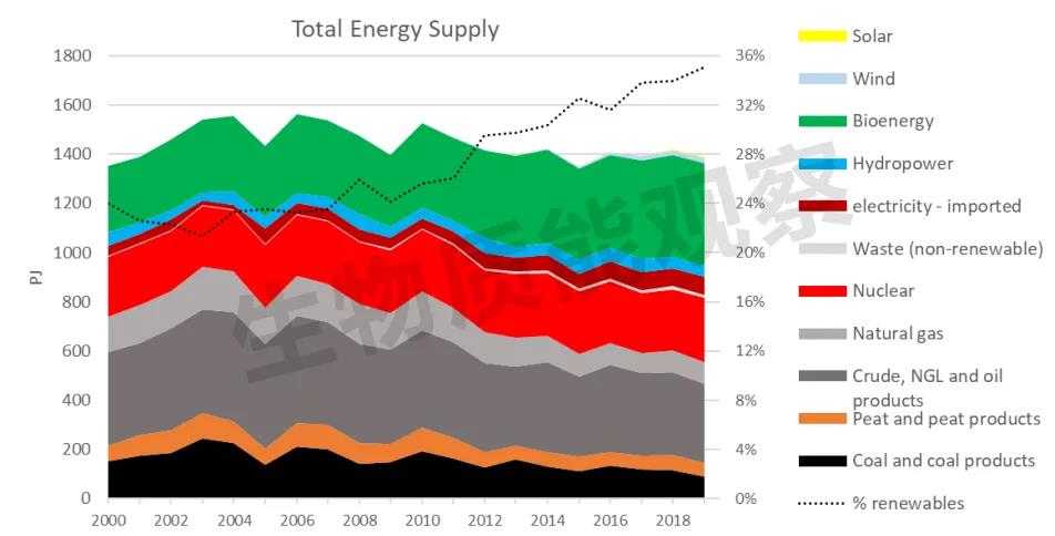 2019年,可再生能源占芬蘭能源供應(yīng)總量的35%,可再生能源在最終能源消耗中的份額為43%。大約85%的可再生能源來(lái)自生物質(zhì)能。