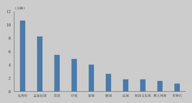 據中國汽車工業協會整理的海關總署數據顯示,2021年,中國新能源汽車出口量排名前十位國家依次是比利時、孟加拉國、英國、印度、泰國、德國、法國、斯洛文尼亞、澳大利亞和菲律賓。與上年相比,上述十國出口量均呈增長,其中斯洛文尼亞、澳大利亞和泰國增速最為明顯。2021年,上述十國新能源汽車出口42.4萬輛,占新能源汽車出口總量的77.8%。
