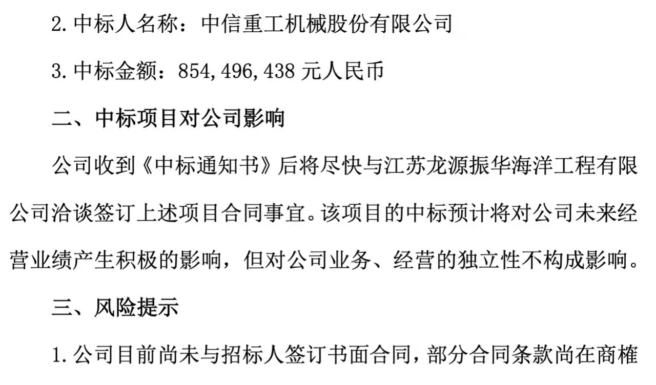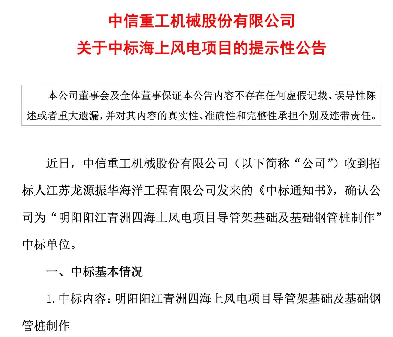 WindDaily獲悉,中國中信集團旗下上市公司中信重工近日中標龍源振華8.54億元訂單,將為明陽陽江青洲四海上風電項目制作導管架基礎及基礎鋼管樁。中信重工主營業(yè)務為重型裝備、工程成套、備件技術服務等,此次中標意味著中信集團殺入海上風電領域。(ps:大家熟知的中信銀行也是中信集團旗下)以下為具體公告:
