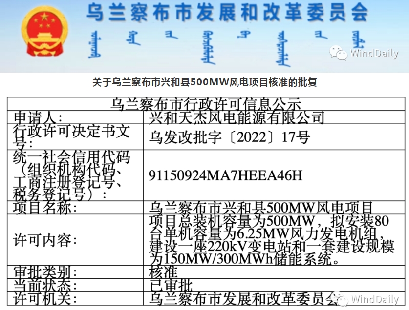 WindDaily獲悉,內蒙古烏蘭察布市發改委近日核準了興和縣500MW風電項目。項目裝機容量500MW,安裝80臺6.25MW風電機組,配置150MW/300MWh儲能系統。以下為公告原文: