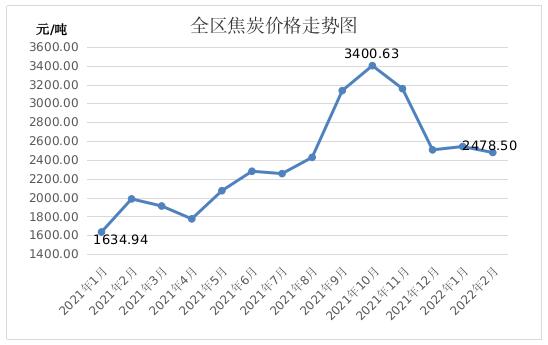 此外,2月份受假期、環(huán)保等因素影響,焦炭價格先降后漲,全區(qū)焦炭月度平均價格為2478.50元/噸,環(huán)比下降2.50%,同比上漲24.80%。3月份,隨著下游鋼廠產(chǎn)量增加,焦炭需求將繼續(xù)向好,但受疫情影響,煉焦用煤進口量存在不確定性,煉焦用煤市場供需偏緊將推高焦炭成本。綜合來看,3月份焦炭價格將有所上漲。