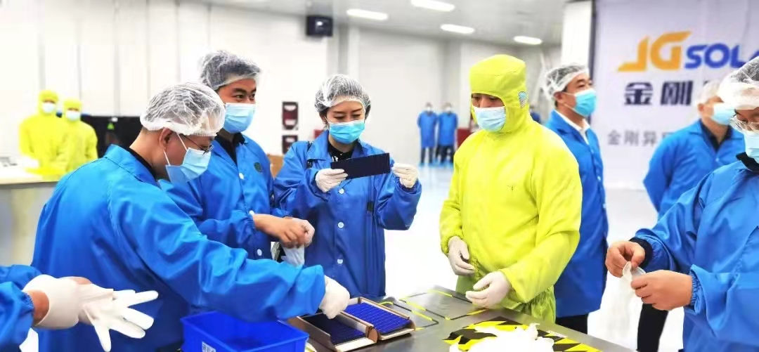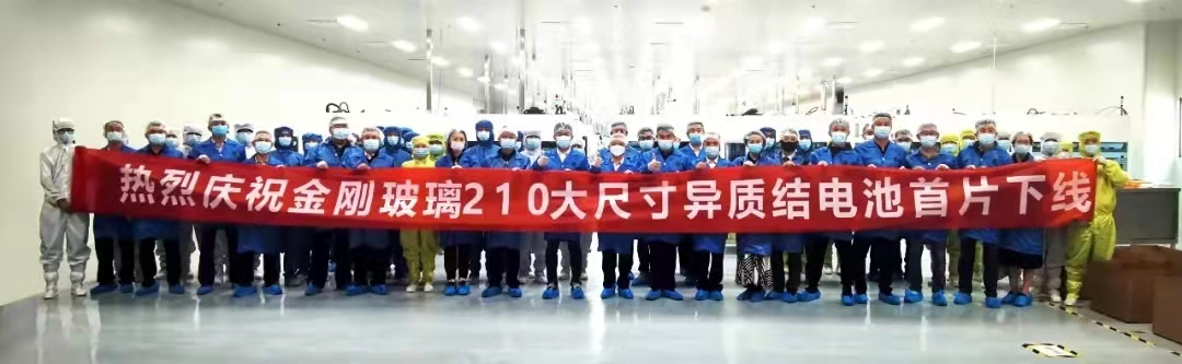 全球經濟受新冠疫情的影響仍在持續,而光伏市場的行情變化亦是跌宕起伏,行業內百家爭鳴,技術革新加速更迭。金剛玻璃異質結項目全體員工踐行“效率決定效益、細節決定成敗、速度決定生死”的生產精神,自2021年7月起,歷經240天,在股東公司歐昊集團的全力支持下,克服了各種生產困難,實現了210大尺寸異質結電池首片的順利下線。