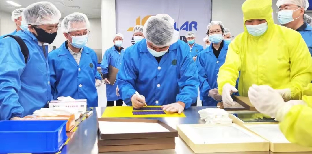 歐昊集團董事長張棟梁先生在210大尺寸異質結首片下線電池上簽字留念
